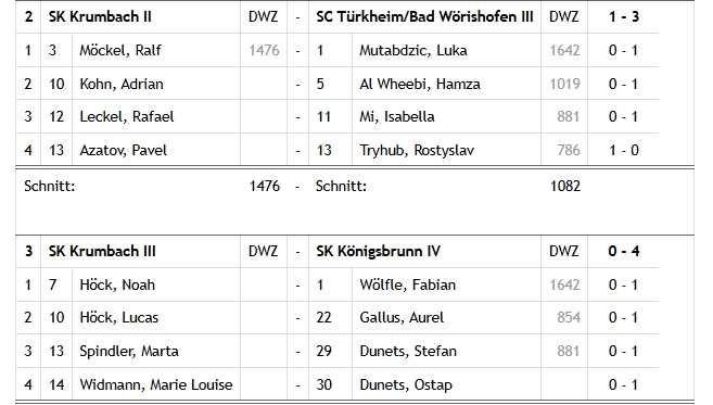 Am 20.12.2025 hatten wir, Krumbach II und III unser 2. Punktspiel in der B-Klasse. Nach unseren Sieg im November  wurden wir wieder auf den realen Boden zurückgeholt. Unsere Spieler haben alle gut gespielt. Es war das erste richtige Punktspiel unter FIFA - Bedingungen. Die anderen hatten da schon viel mehr Erfahrung. man sieht es an der DWZ-Bewertung.